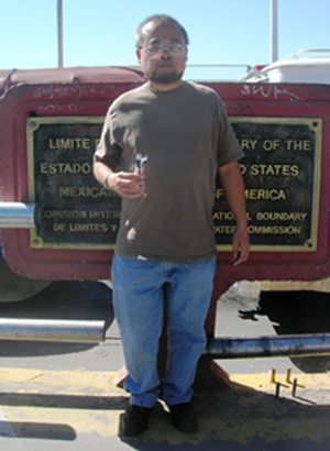 Đinh Linh đang đứng giữa biên giới Mỹ và Mexico tại El Paso/Ciudad Juarez.