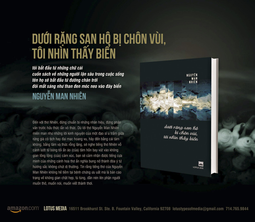 dưới rặng san hô bị chôn vùi, tôi nhìn thấy biển, tập thơ của Nguyễn Man Nhiên, do Lotus Media xuất bản tại Hoa Kỳ, 8-2015. Sách dày 238 trang, gồm 80 bài thơ và một số tranh minh họa của chính tác giả, với lời Mở của nhà báo Uyên Nguyên và lời Bạt của nhà văn/dịch giả Nhật Chiêu và nhà nghiên cứu văn học Nguyễn Thành Thi. Sách có bán trên amazon.com